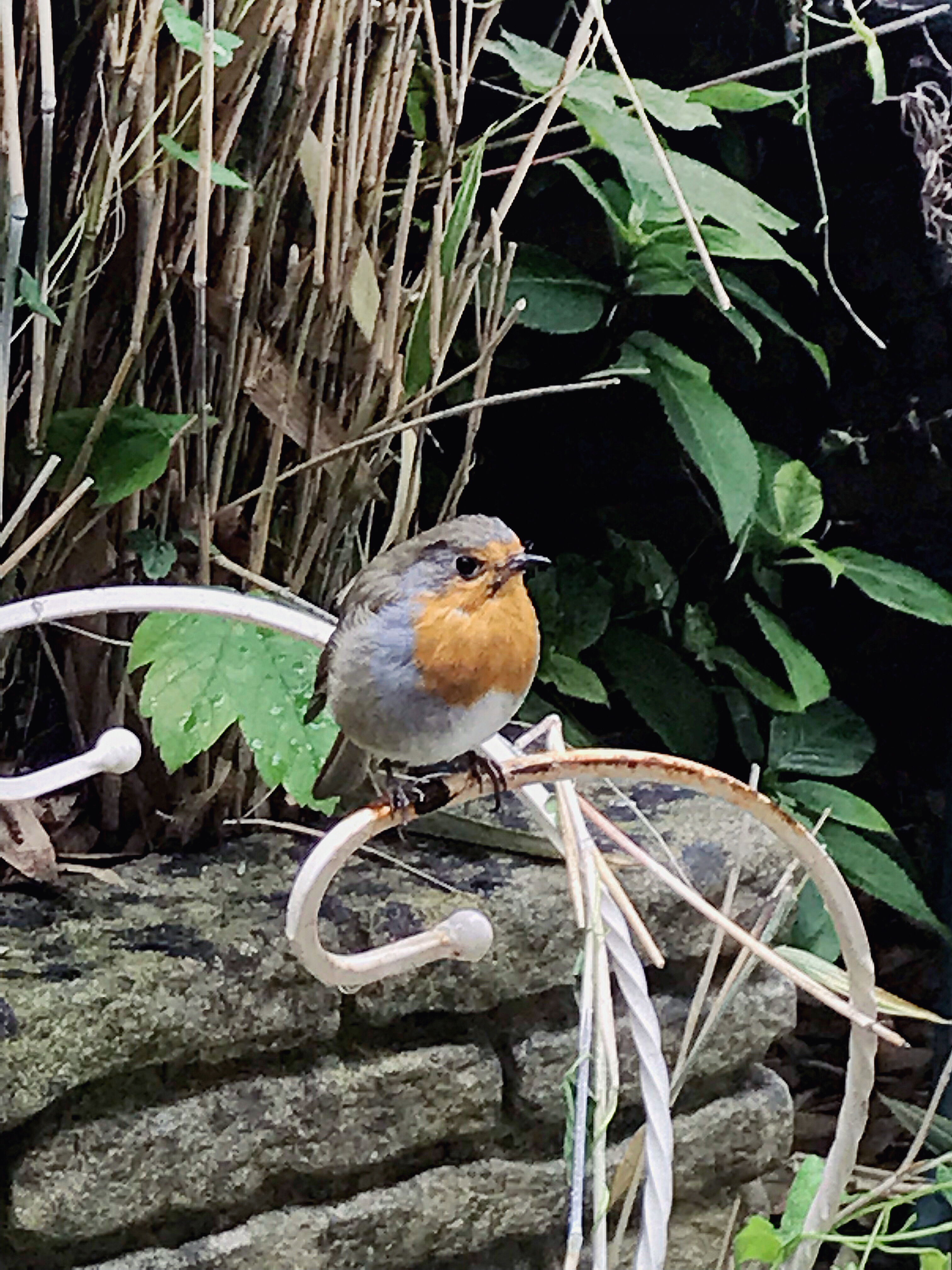 A robin emerged from the bamboo, he appeared in my peripheral vision, as if to wink or raise its eyes. It sat watching me, watching it and all sense of movement dropped away, till we were locked, bird and women, woman and bird, neither one of us moving but both of us remembering the fledglings that we were.